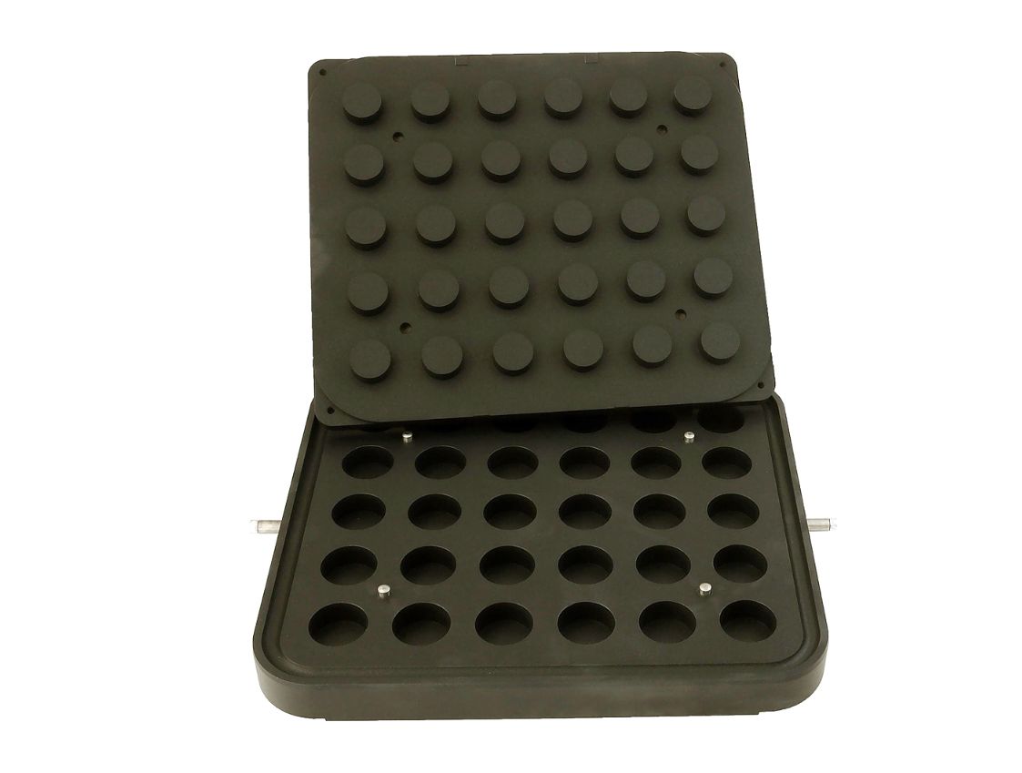 Форма для круглых тарталеток DH Tartmatic Plate 39 KOCATEQ используется совместно с тарталетницей DHTartmatic на предприятиях общественного питания и торговли, в пекарнях и кондитерских для выпечки тарталеток. Форма представляет собой 2 пластины, одна из которых с выемками крепится к неподвижной станине тарталетницы, другая с выпуклостями к верхней подвижной части. Модель оснащена 30 круглыми формами. Антипригарное покрытие пластин выполнено из теплопроводящего сплава.