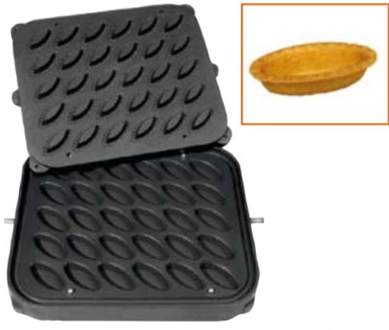 Форма для овальных тарталеток DH Tartmatic Plate 15 KOCATEQ используется совместно с тарталетницей DHTartmatic на предприятиях общественного питания и торговли, в пекарнях и кондитерских для выпечки тарталеток. Форма представляет собой 2 пластины, одна из которых с выемками крепится к неподвижной станине тарталетницы, другая с выпуклостями к верхней подвижной части. Модель оснащена 30 овальными формами. Антипригарное покрытие пластин выполнено из теплопроводящего сплава.