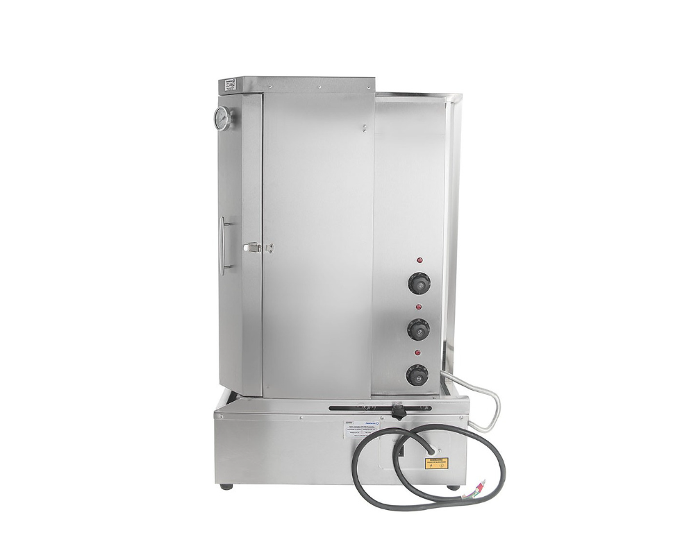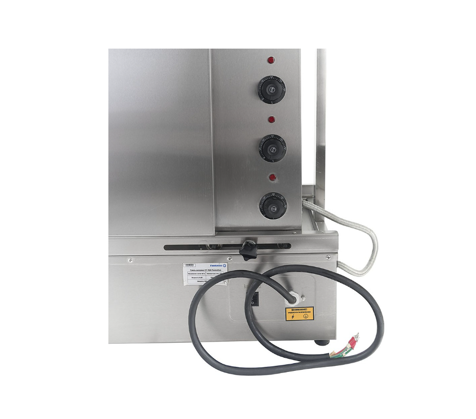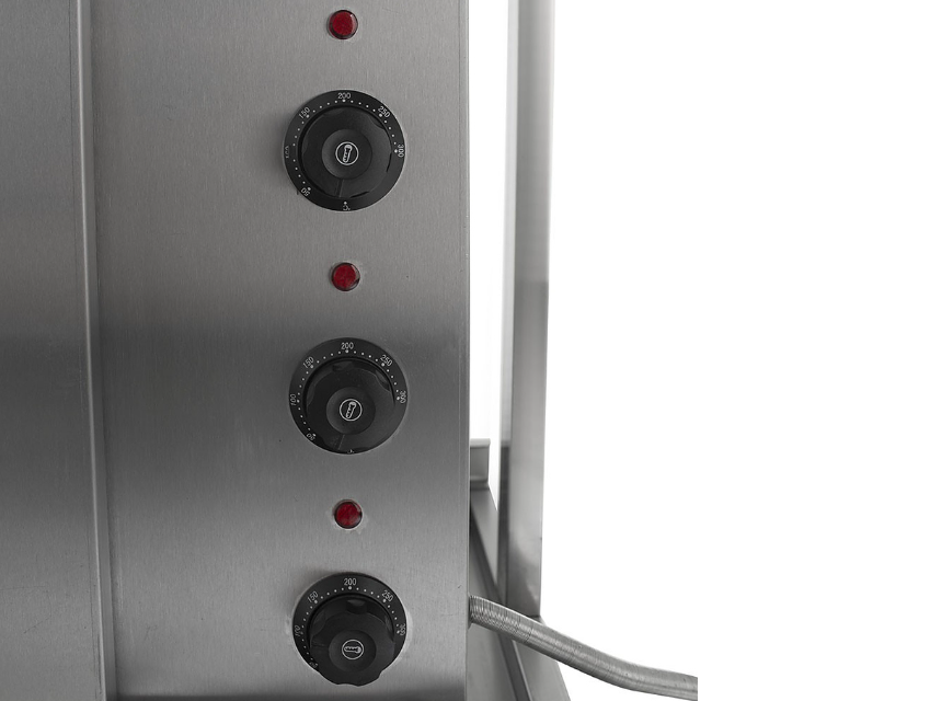 Гриль для шаурмы Foodatlas CY-70A предназначен для обжарки мяса на предприятиях общественного питания и торговли. Модель оснащена поддоном для масла, 3 нагревательными элементами, 3 регуляторами температуры и защитными створками. Корпус выполнен из нержавеющей стали.