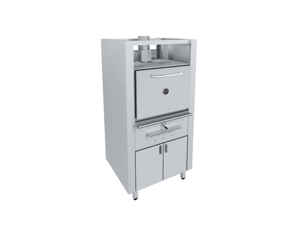 Лицевая рамка сделана из жаростойкой нержавеющей стали толщиной 5 мм. Внутри камеры имеются направляющие для решетки и подставки под шампура. В нижней части камеры установлен ящик для золы. Выше ящика есть дефлектор подачи воздуха, поворачивая ручку, можно добавлять или убавлять приток воздуха. Наверху на камере есть шибер с искрогасителем. Шибер применяется для регулировки воздуха. Искрогаситель имеет лабиринтную форму для задержания искр и копоти. Жарочная камера установлена на сварном каркасе и обшита нержавеющими панелями. На передней части двери имеется термометр, который показывает температуру в камере. Решетка, ограждение углей уложены во внутрь.