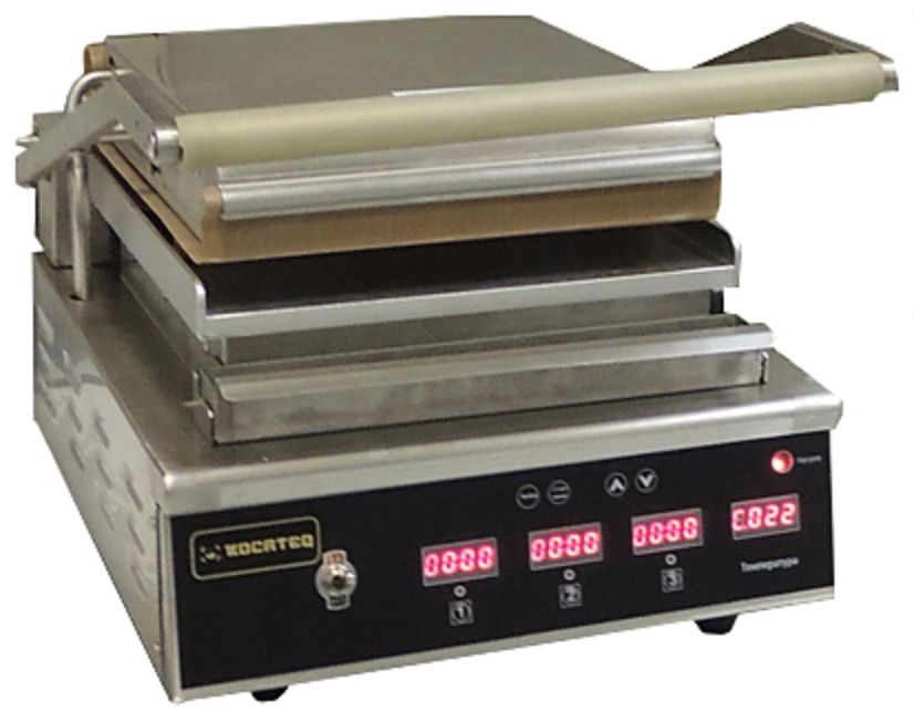 Гриль пресс для жарки стейков и гамбургеров GH12 KOCATEQ предназначен для жарки мяса, птицы, рыбы и овощей, приготовления стейков, гамбургеров и горячих сэндвичей на предприятиях общественного питания и торговли. Гриль оснащен цифровой панелью управления, цифровым термостатом для контроля и регулировки температуры таймером обратного отсчета до 99 минут. Корпус выполнен из нержавеющей стали AISI 304 толщиной 1,2 мм, ножки из пластика.