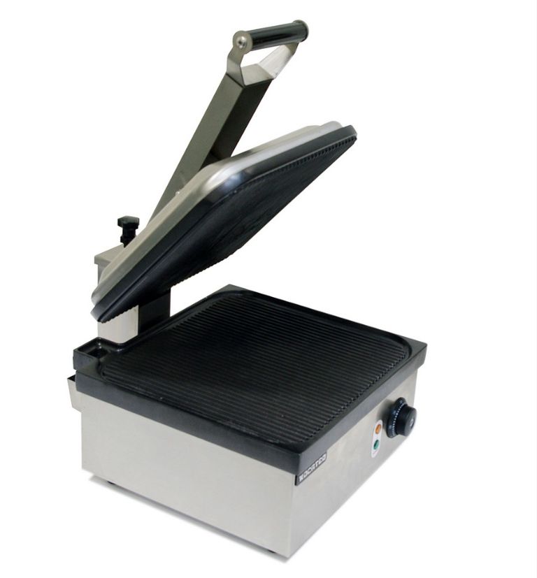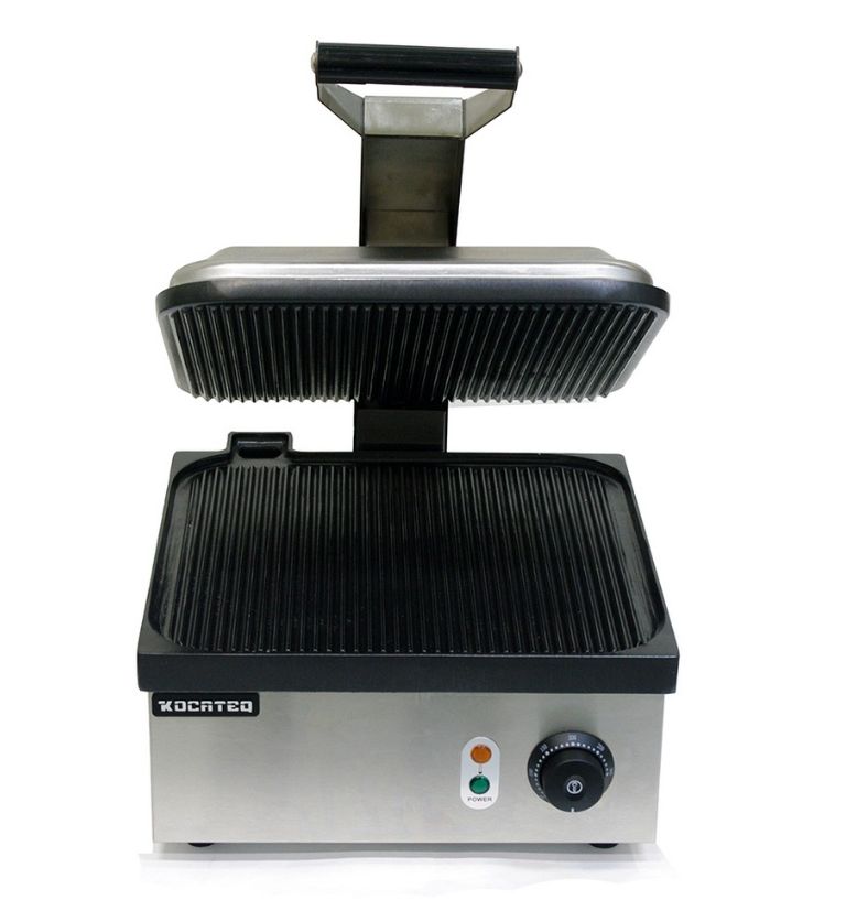 Гриль пресс односекционный GH811maxiNW KOCATEQ предназначен для жарки мяса, птицы, рыбы и овощей, приготовления стейков, гамбургеров и горячих сэндвичей на предприятиях общественного питания и торговли. Гриль оснащен механической панелью управления, аналоговым термостатом для регулировки температуры, лотком для сбора жира и пластифицированными ножками. Корпус выполнен из нержавеющей стали AISI 430 толщиной 0,8 мм, рабочие поверхности из литой стали с антипригарным покрытием.