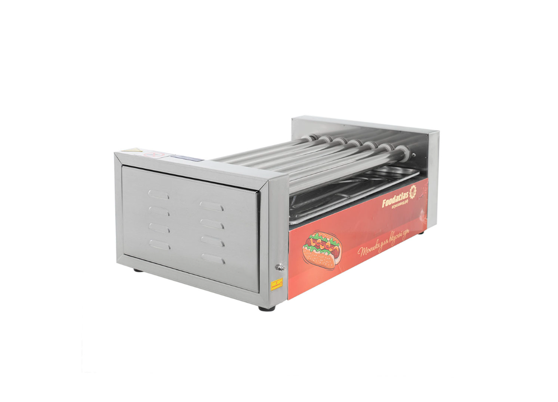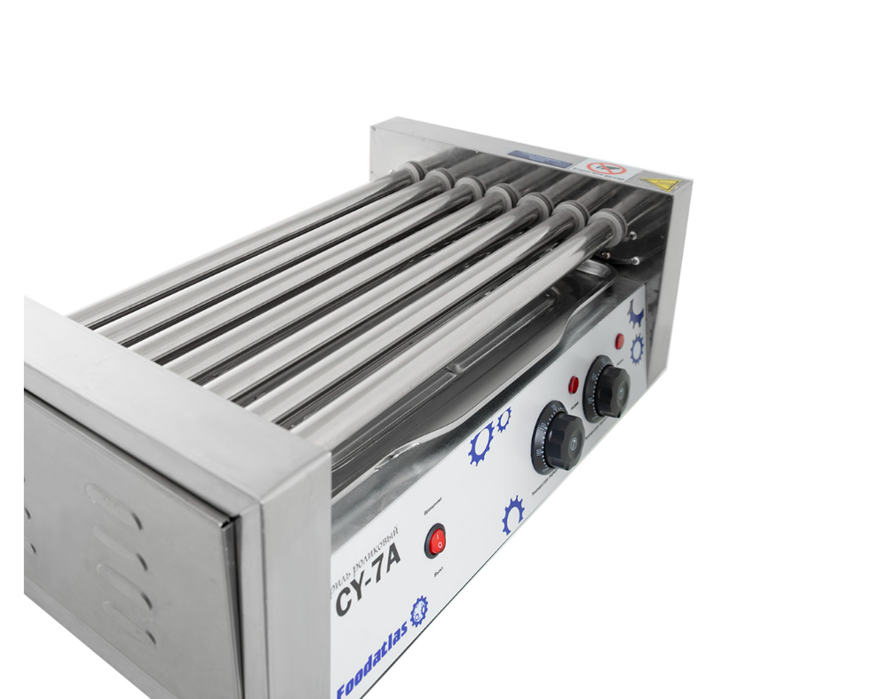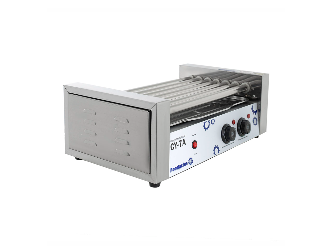Роликовый гриль Foodatlas CY-7A предназначен для быстрого равномерного обжаривания сосисок, сарделек и колбасок на предприятиях общественного питания и торговли. Гриль оснащен 2-мя терморегуляторами, 7 ТЭНами, уплотнительными силиконовыми кольцами на торцах роликов и подсветкой. Корпус и ролики выполнены из нержавеющей стали.