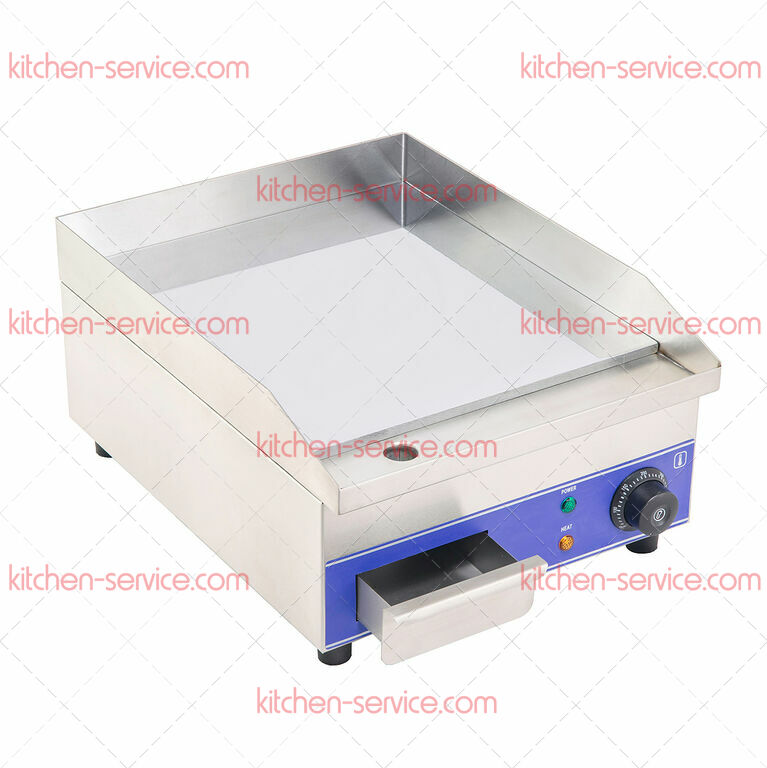 Гриль-сковорода GH350 KOCATEQ предназначена для приготовления жареных мясных блюд, яичницы, жареной рыбы, оладьев, котлет и гамбургеров на предприятиях общественного питания и торговли. Модель оснащена плоской стальной жарочной поверхностью, термостатом для регулировки температуры и защитным термостатом, автоматически отключающим напряжение при повреждении основных термостатов. Рабочая поверхность выполнена из стали толщиной 12 мм, корпус - из нержавеющей стали Aisi 201, ножки - из пластика.