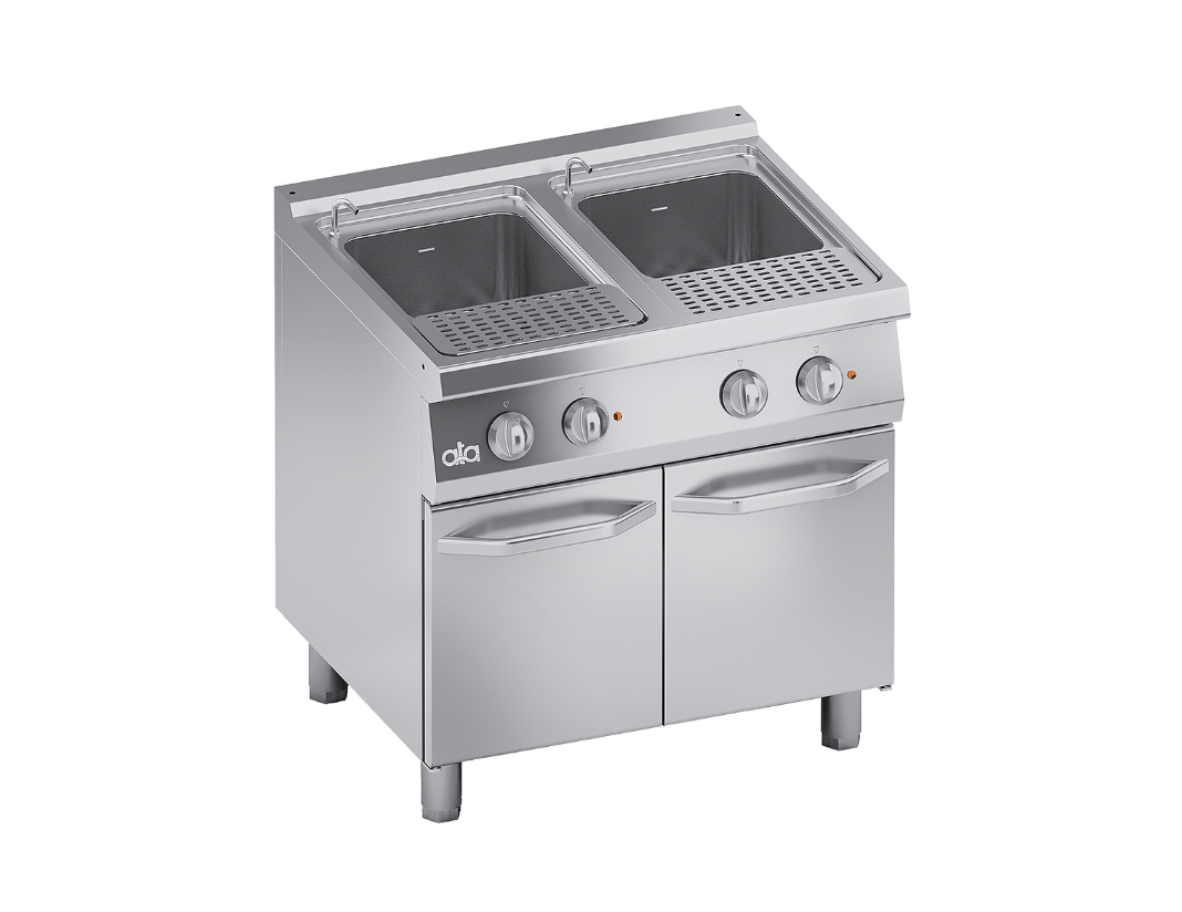 Макароноварка электрическая 26+26 л K7ECPP10 ATA предназначена для варки всех видов макаронных изделий, пельменей, вареников, овощей, корнеплодов и яиц на предприятиях общественного питания и торговли. Оснащена электромеханической панелью управления и предохранительным термостатом с ручным повторным включением против работы всухую. Корпус и ножки выполнены из нержавеющей стали, формованный резервуар с закругленными краями - из нержавеющей стали AISI 316, рабочая поверхность - из стали AISI 304, атермические ручки - из пластика с трафаретной печатью по краям.