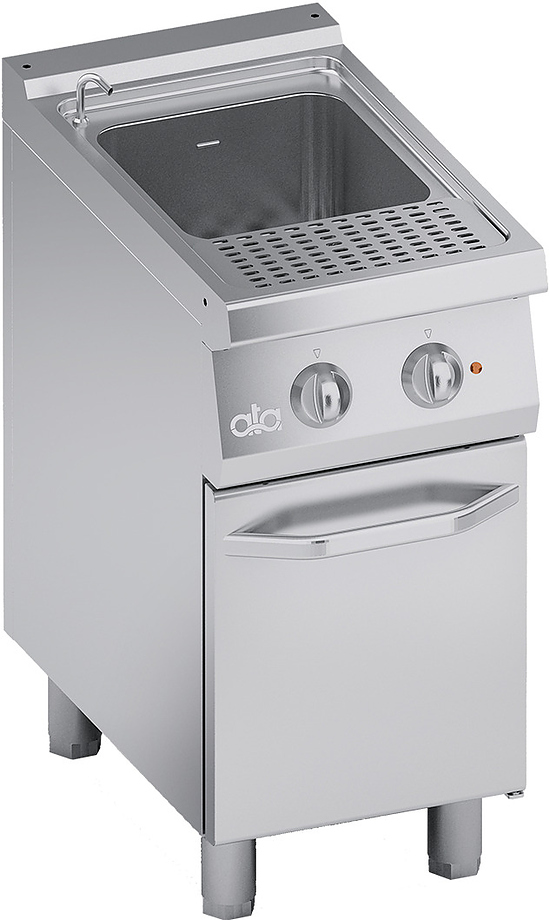 Электрическая макароноварка АТА ELECTRIC PASTA COOKER 26 LT предназначена для варки всех видов макаронных изделий, пельменей, вареников, овощей, корнеплодов и яиц на предприятиях общественного питания и торговли. Данная модель оснащена электромеханической панелью управления и ручным предохранительным термостатом. Формованный резервуар изготовлен из нержавеющей стали AISI 316 с закругленными краями, рабочая поверхность - из стали AISI 304.