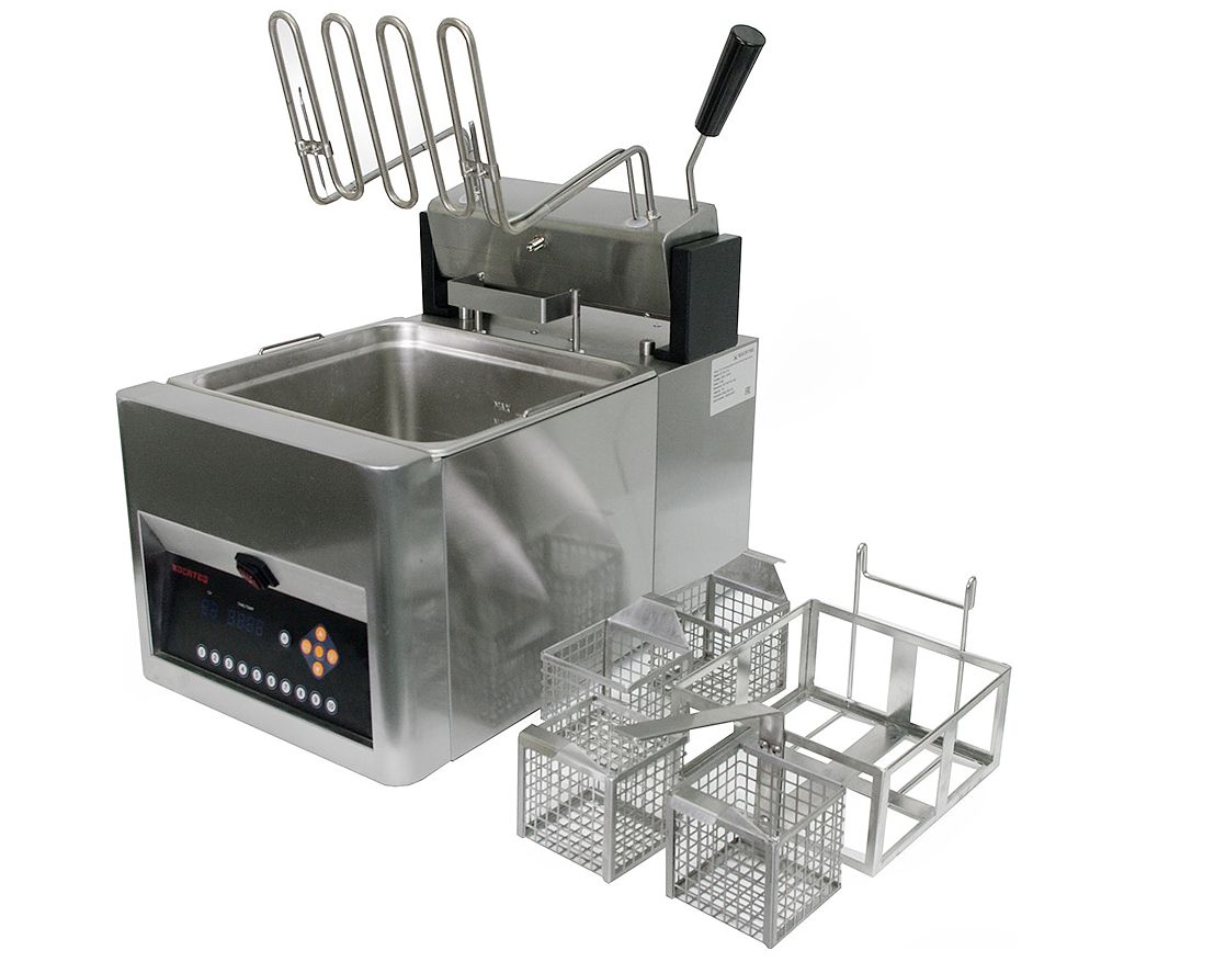 Макароноварка настольная EST12LC10 KOCATEQ используется на предприятиях общественного питания и торговли для отваривания кукурузы, фрикаделек, макаронных изделий, пельменей, вареников, овощей, фруктов и прочих продуктов. Макароноварка оснащена программируемой панелью управления и контролем времени, оставшегося до окончания приготовления. 4 порционных вкладыша и корпус выполнены из нержавеющей стали AISI 304.