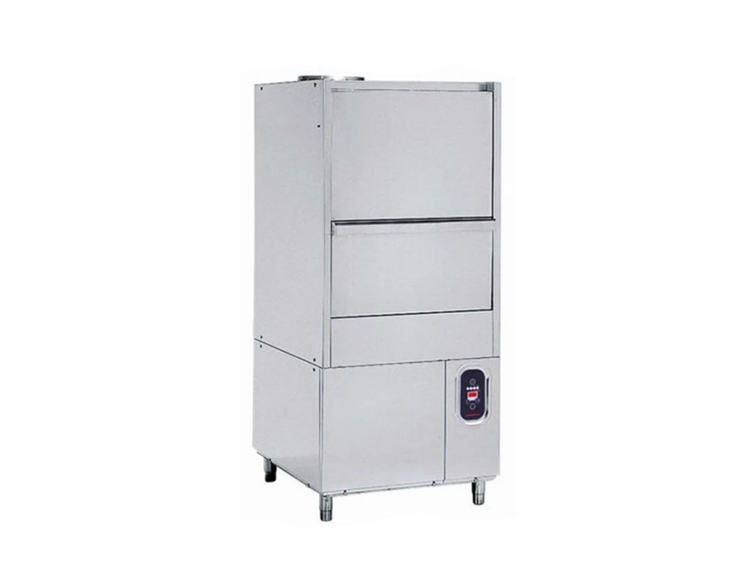 Внутри котломоечной машины находится глубокий бесшовный бак с закругленными углами, конструкция которого препятствует скоплению грязи в местах сварки и изгибов. Давление воды при процессе мойки поддерживает насос (для данного класса посудомоек), который использует всего 3 литра чистой горячей воды за цикл, что обеспечивает низкий уровень операционных затрат (энергия, вода, химические средства). Следует обратить внимание на конструкцию дверцы, она состоит из двух частей: одна опускается вперед и вниз, а вторая поднимается вверх.