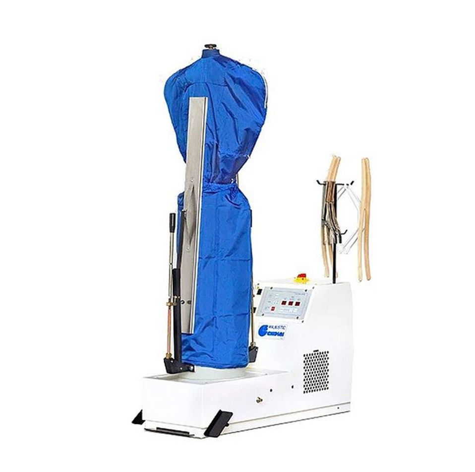 Пароманекен MAJESTIC V GHIDINI - универсальный пароманекен для финишной отделки пальто, пиджаков, курток, платьев и т.д. Возможность установки до девяти программ для регулировки подачи пара и времени сушки. Требуется подключение внешнего источника пара.
