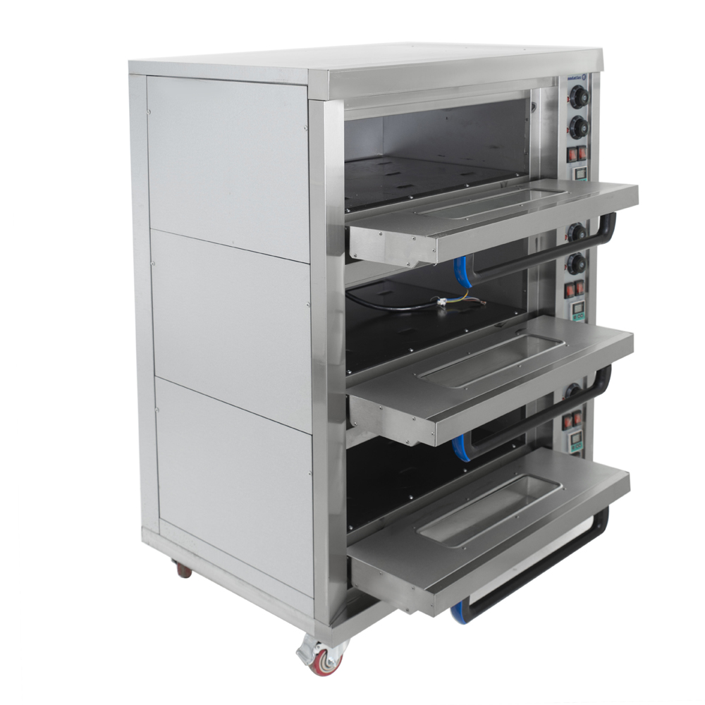 Хлебопекарная печь Foodatlas HEO-33 используется на предприятиях общественного питания и торговли для выпечки широкого ассортимента хлебобулочных и кондитерских изделий: хлеба пшеничного, ржано-пшеничного формового и подового, хлебобулочной продукции, мучных кондитерских изделий, просфор, куличей и приготовления мясных, овощных блюд. Печь оснащена 3 камерами, электромеханической панелью управления с 6 реле для регулировки температуры, ТЭНами, расположенными внизу и вверху камер, внутренней подсветкой и дверями с ненагревающимися ручками и смотровыми окнами, позволяющим контролировать рабочий процесс. Корпус выполнен из окрашенной стали, передняя панель - из нержавеющей стали и стекла.