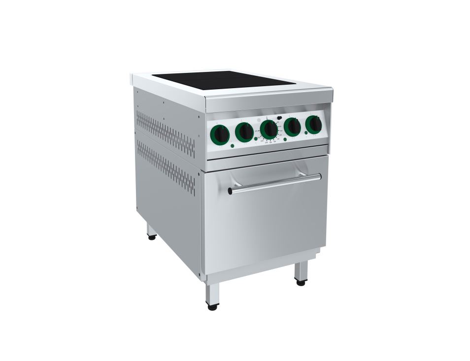 Корпус плиты выполнен - лицевая и верхняя части из нержавеющей стали, остальные части из стали оцинкованной. Плита оснащена двумя чугунными конфорками. Плита имеет жарочный шкаф на 4 уровня для противней/гастроёмкостей GN 1/1
