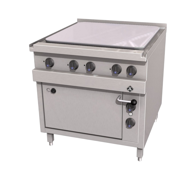 Плита электрическая с 4-зонной варочной панелью и электрическим духовым шкафом 2/1 GN, Optima 850 MKN. Жарочная поверхность выполнена из хромированной стали с неотражающим покрытием.