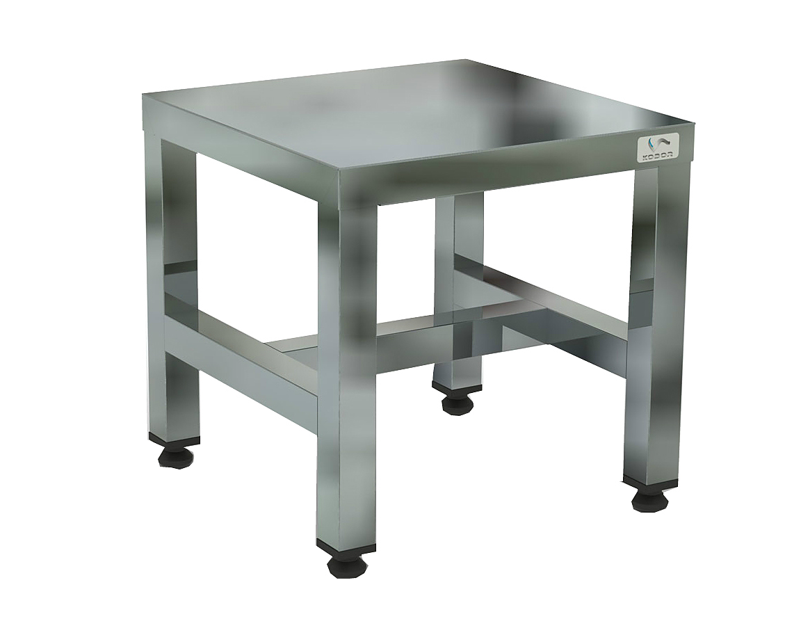 Подставка ПП-50/50 КОБОР изготовлена из нержавеющей стали aisi 430 с усилением ЛДСП, каркас из нержавеющей квадратной трубы 40х40 мм, что придает прочность конструкции. Ножки регулируются по высоте позволяя избежать наклона рабочей поверхности.