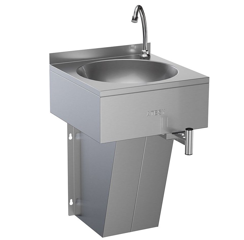 Консольный рукомойник ATESY ВРНК-400 используется на предприятиях общественного питания и торговли для мытья рук персонала. Модель оснащена рычагом, при нажатии на который бедром (ногой) из установленного на ванну носика поступает вода. Ванна выполнена из нержавеющей стали AISI 304 толщиной 0,8 мм.