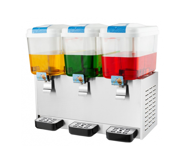 Диспенсер (сокоохладитель) YSJ18×3 ROAL для холодных жидких продуктов изготовлен в соответствии с зарубежными технологиями. В нем можно приготовить различные холодные напитки, соки. Удобная конструкция, красивый внешний вид, удобство и простота в эксплуатации делают незаменимой для использования в ресторанах, кафе, развлекательных учреждениях. Главные части аппарата выполнены из нержавеющей стали, и безопасного пластика. В оборудовании встроен автоматический датчик температуры для приготовления холодных напитков, охлаждения. Наличие 1-го, 2-х и 3-х емкостей для напитков, позволяют смешивать 1, 2 или 3 вида напитков одновременно, что очень выгодно потребителям. Аппарат можно использовать круглый год. Холодильная система заполнена не озоноразрушающим хладагентом R290 (пропан)