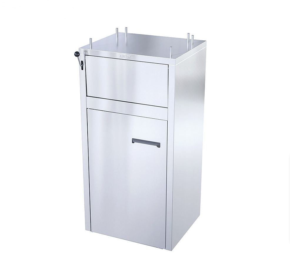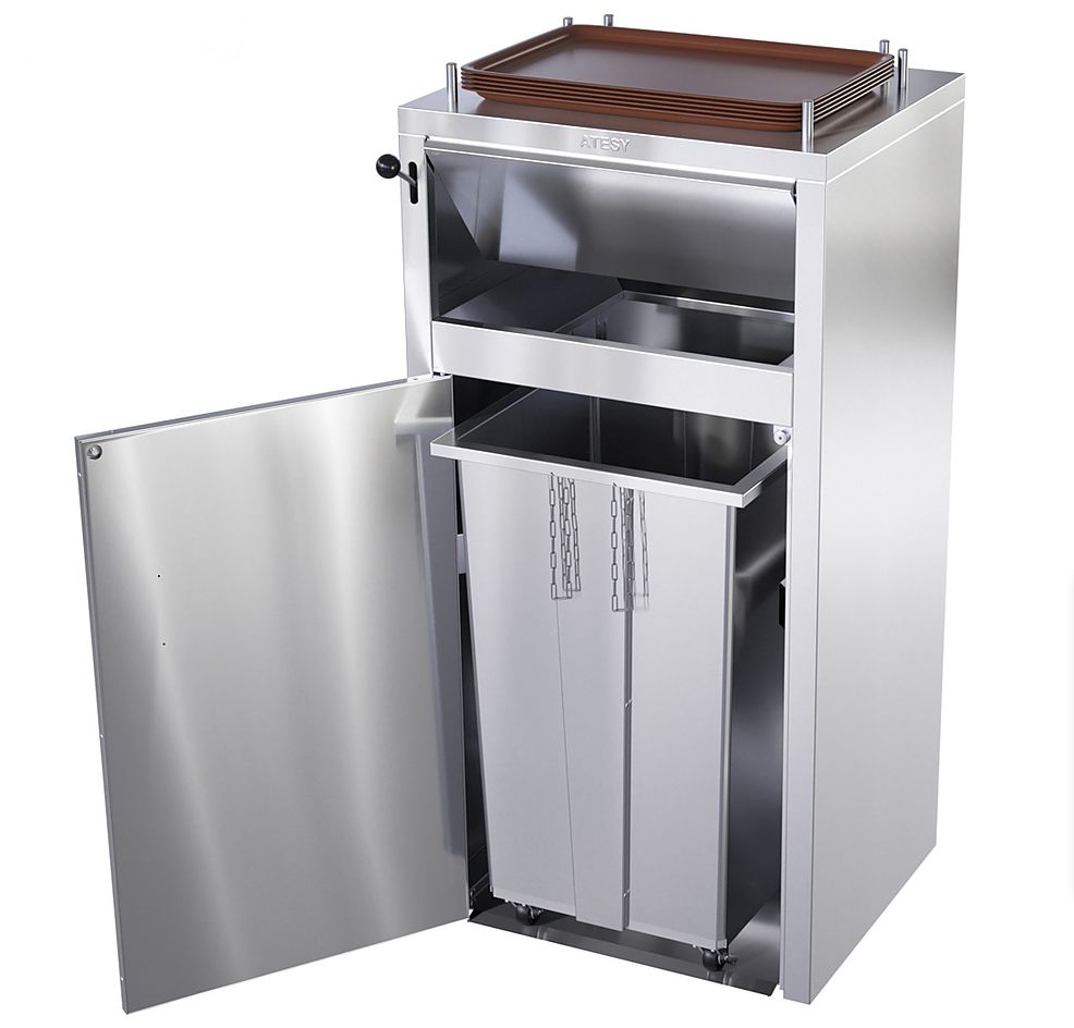 Станция сбора отходов ATESY ССО-120-Р-01 используется на предприятиях общественного питания и в ресторанах самообслуживания для сбора пищевых отходов, одноразовой посуды и упаковки от фастфуда, а также для временного хранения использованных подносов. Модель состоит из тумбы и служащей мусороприемником внутренней емкости на колесах, используемой совместно с мешком для мусора. Тумба и емкость выполнены из шлифованной легированной стали.