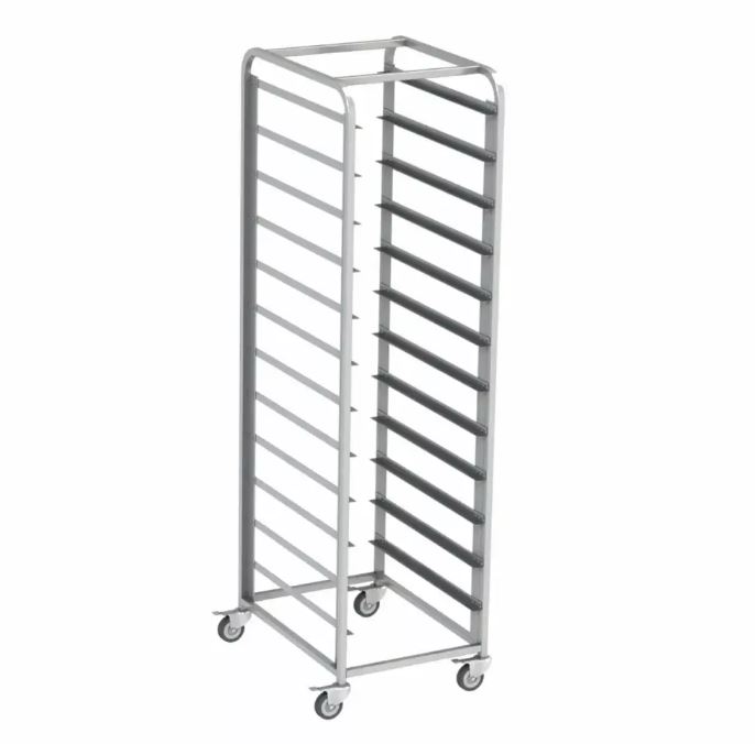 Стеллаж-тележка TR-15 (400x600) WLBAKE предназначена для транспортировки и кратковременного хранения полуфабрикатов и готовой продукции на предприятиях пищевой промышленности и в пекарнях. тележка оснащена 4-мя колесами, 2 - с тормозами. Загрузка происходит по узкой стороне. Сборно-разборная конструкция выполнена из нержавеющей стали.