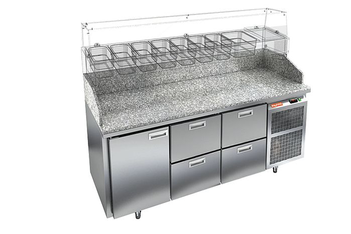 Стол для пиццы HICOLD PZ3-122/GN КАМЕНЬ предназначен для использования на профессиональной кухне и сочетает в себе функциональность рабочей поверхности и холодильной камеры. Он используется для приготовления полуфабрикатов пиццы, салатов, бутербродов, суши. Конструкция стола включает в себя столешницу, трехсекционную холодильную камеру и витрину с возможностью размещения контейнеров формата GN.