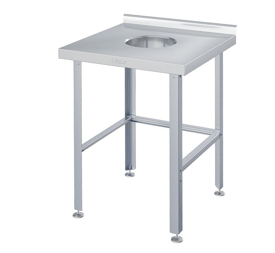 Стол производственный ATESY СРО-С-1-600.600-02 предназначены для использования в различных производственных цехах предприятий общественного питания для сбора пищевых отходов. В центре столешницы имеется отверстие, под которым помещается ёмкость для сбора отходов. Столешница выполнена из нержавеющей стали AISI 430 толщиной 0,8 мм, каркас - из трубы диаметром 40 мм из нержавеющей стали AISI 201, ножки - из нержавеющей стали, опора ножек - из пластика.