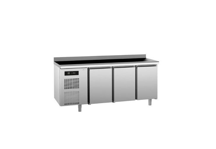Стол холодильный KUJBA SAGI предназначен для использования на профессиональной кухне и сочетает в себе функциональность рабочей поверхности и холодильной камеры. Он используется для приготовления и охлаждения пищевых полуфабрикатов, напитков, блюд. Конструкция стола включает в себя стальную столешницу с бортом и трехсекционную холодильную камеру для размещения контейнеров формата GN. Столешница выполнена из нержавеющей стали AISI 304. Она снабжена звукопоглощающей панелью, защитой от огня, протеканий и высокого напряжения. Задний край столешницы отделан 85-мм бортом, позволяющим комфортно поместить стол у стены и избежать ее загрязнения во время работы.