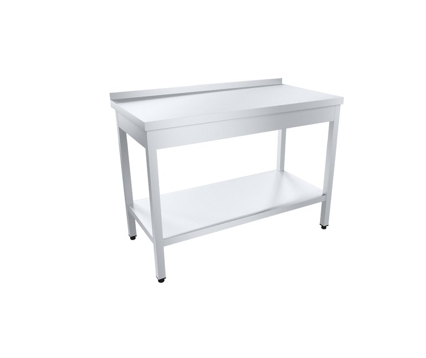 Столешница изготавливается из нержавеющей стали марки AISI 430 или марки AISI 304 толщиной 0,8 мм и дополнительно усиливается ЛДСП (ламинированным листом древесно-стружечной плиты) толщиной не менее 16 мм. Каркас имеет усиленную конструкцию, изготавливается из нержавеющей трубы квадратного сечения 40х40 мм. Столы оснащаются сплошными полками из нержавеющей стали. Ножки оснащаются винтовыми опорами, позволяющими регулировать высоту стола от 850 до 870 мм. Изделие поставляется в разобранном виде. Упаковка -гофрокартон
