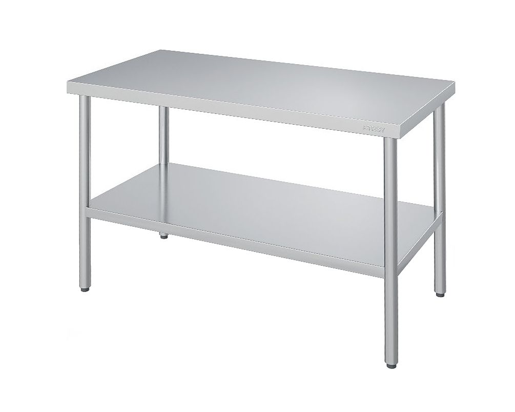 Стол разделочный ATESY СР-П-950.600-02 широко применяется в различных производственных цехах предприятий общественного питания, супермаркетах, комбинатах пищевой промышленности для разделывания и обработки пищевых продуктов, а также в качестве вспомогательной поверхности для кухонного оборудования. Сплошная полка и столешница выполнены из нержавеющей стали AISI 430 толщиной 0,8 мм, каркас - из трубы диаметром 40 мм из нержавеющей стали AISI 201, ножки - из нержавеющей стали, опора ножек - из пластика.
