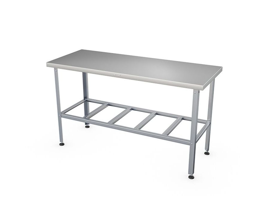 Стол разделочный ATESY СР-С-1200.800-02 широко применяется в различных производственных цехах предприятий общественного питания, супермаркетах, комбинатах пищевой промышленности для разделывания и обработки пищевых продуктов, а также в качестве вспомогательной поверхности для кухонного оборудования. Полка-решётка, и столешница выполнены из нержавеющей стали AISI 430 толщиной 0,8 мм, каркас - из трубы диаметром 40 мм из нержавеющей стали AISI 201, ножки - из нержавеющей стали, опора ножек - из пластика.