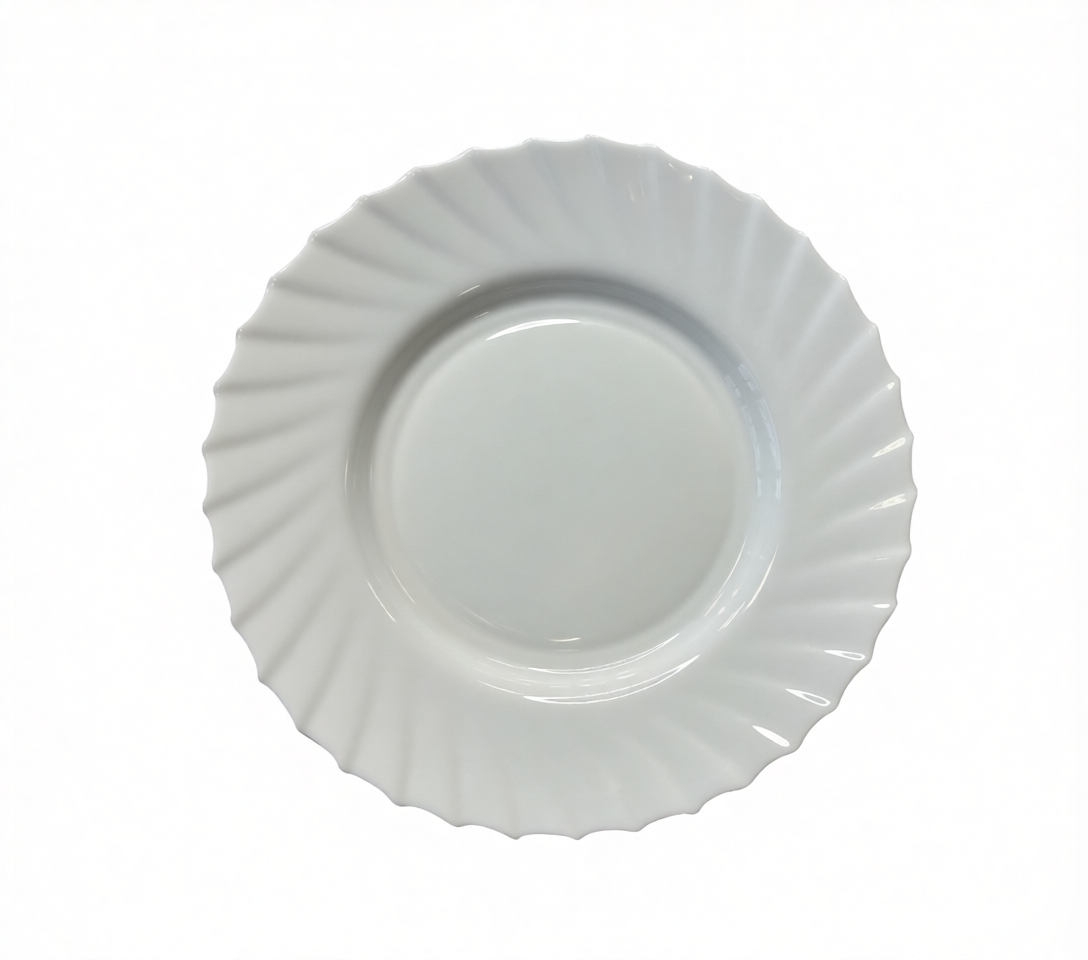 Поверхность посуды: гладкая, борт тарелок выполнен в виде рельефа однородная волна