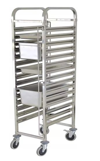 Тележка-шпилька для гастроемкостей MXRT1511MG9 используется на предприятиях общественного питания и торговли для транспортировки и хранения противней. Модель оснащена 4 поворотными колесами, 2 из которых снабжены тормозными устройствами. Тележка не подходит для использования внутри ротационных печей или камер шоковой заморозки. Каркас выполнен из стали 201.