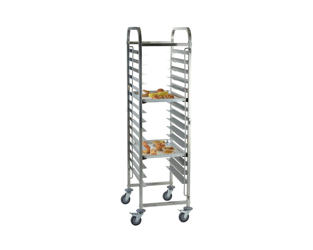 Тележка-шпилька VIATTO RT6415 предназначена для хранения и транспортировки противней на предприятиях общественного питания, пекарнях и кондитерских цехах. Изготовлена из нержавеющей стали. Установлена на 4 колеса, 2 - с тормозом.