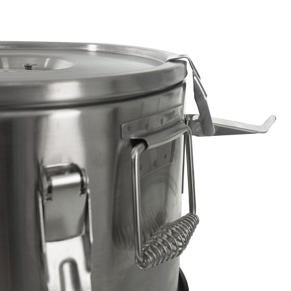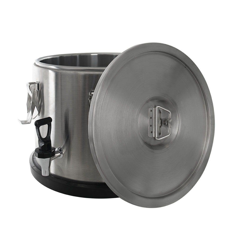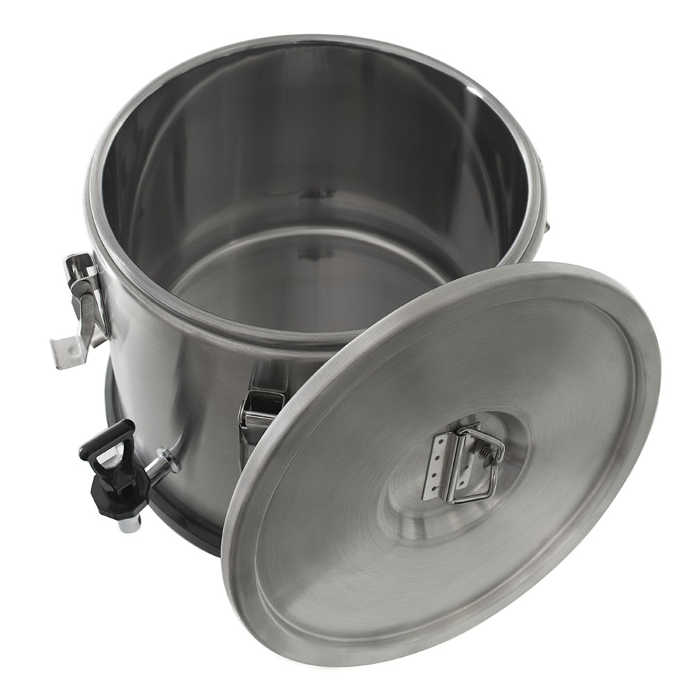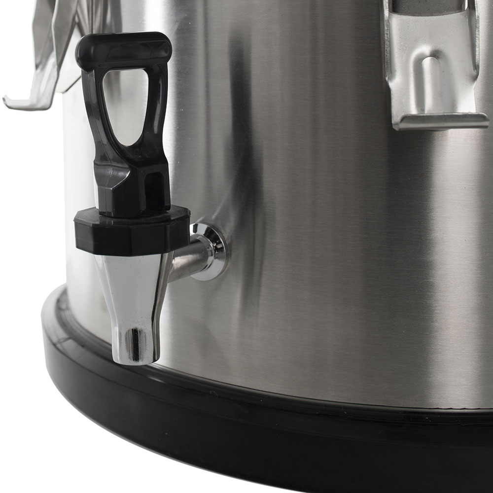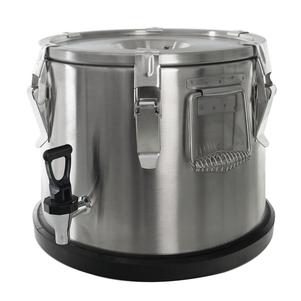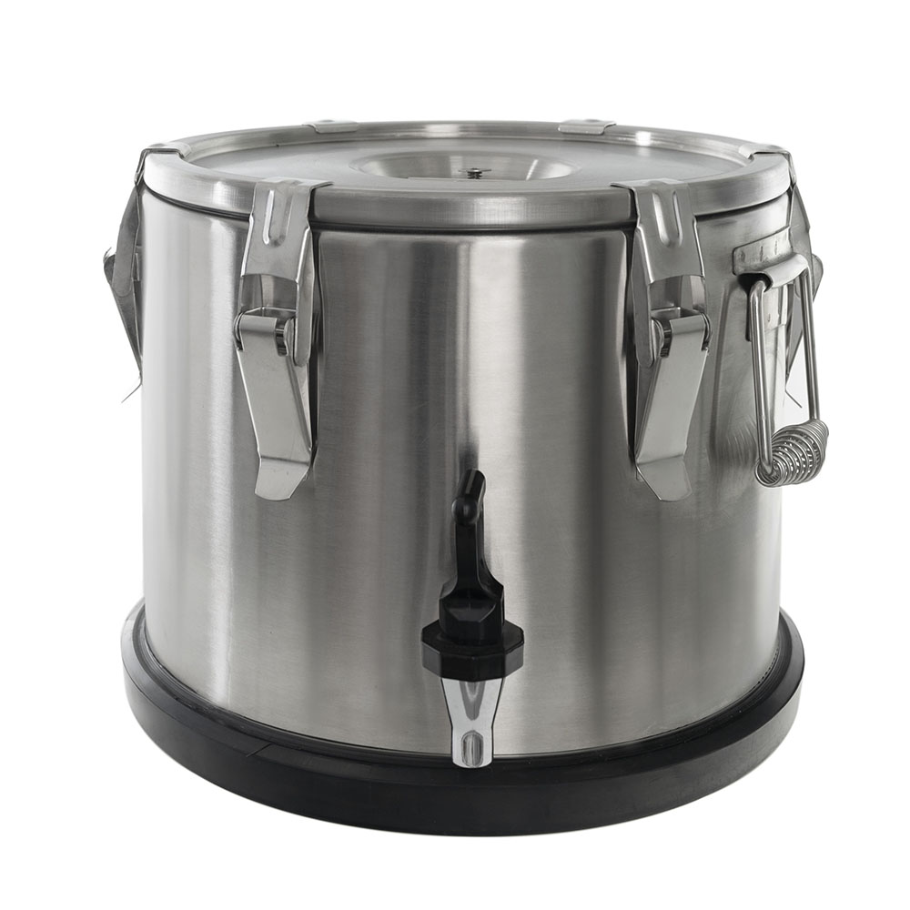 Термоконтейнер Pro 15 л (нержавеющая сталь, с краном) FOODATLAS предназначен для перемещения горячих и холодных готовых блюд и напитков в разогретом и охлажденном виде в течение нескольких часов. Оснащен краном для розлива, 2-мя рукоятками, нескользящей прокладкой под дном и герметичной крышкой со складной ручкой и 6 замками-защелками. Корпус выполнен из нержавеющей стали, изоляция из пенополиуретана, прокладка из силикона, упаковка - картонная коробка.