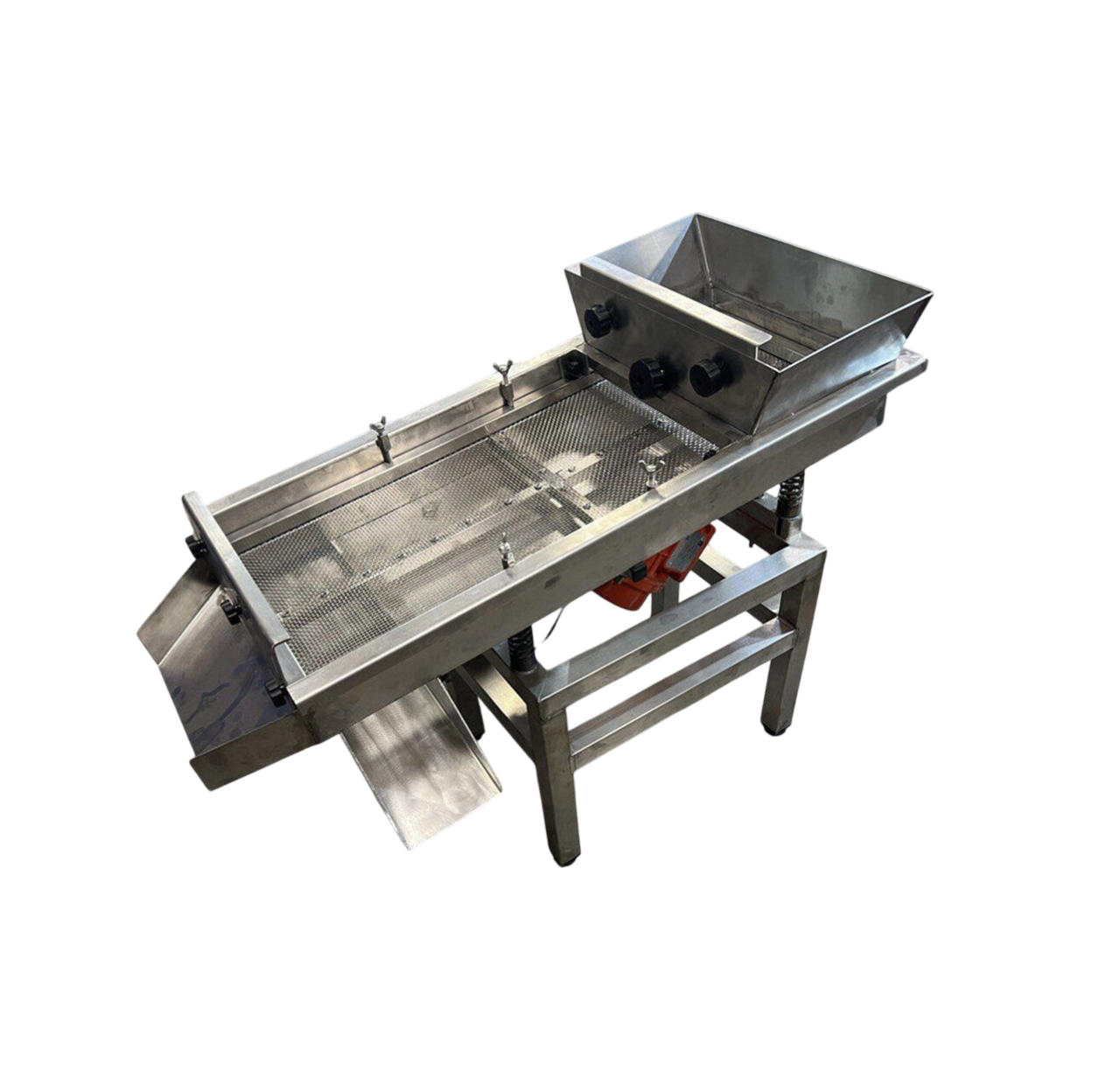 Вибросепаратор ВС-1 2 фракции, 300-500 кг, окрашенное исполнение МЕХАНИЗМЫ. Мобильный и компактный высокопроизводительный разделитель гранул семян, орехов и других сыпучих продуктов. Разработан для небольших площадей. Удобный и надежный, имеет классическую компоновку промышленного вибросепаратора. В конструкции вибросепаратора установлены шиберные заслонки на выход продукта из приемного бункера и на сход продукта с калибровочного сита - это позволяет регулировать скорость схода продукта по ситу. Пульт управления имеет регулировку скорости работы сита - т.е. частоту вибрации.