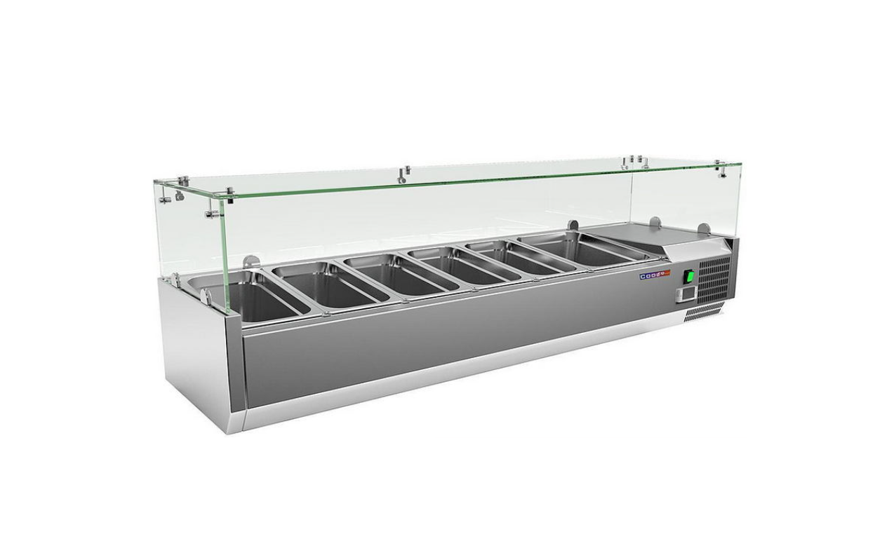 Витрина холодильная настольная VRX 2000/380 COOLEQ используется в кулинарии, в буфетах, столовых, кафетериях для выкладки салатов, закусок, холодных блюд в заранее установленные гастроемкости для их дальнейшей реализации. Модель оснащена цифровым термостатом и индикаторами охлаждения и работы компрессора. Корпус выполнен из нержавеющей стали.