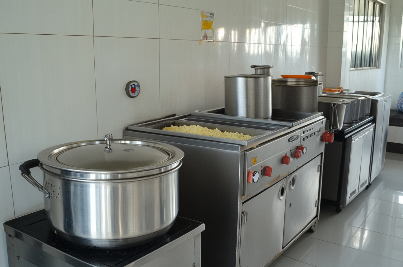 Современный пищеблок оснащается профессиональным оборудованием для приготовления больших объемов пищи. В стандартный набор входят: